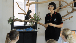 Candice (Education Officer) doing a student education session on-site at Kaarakin. She is upstaged by Chasey, one of Kaarakin's lovely Carnaby’s.