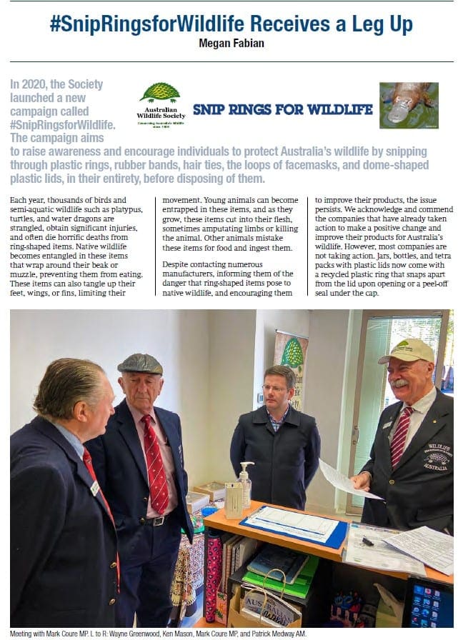 The Snip Rings for Wildlife campaign, established by the Society in 2020, aims to raise awareness and encourage individuals to protect Australia’s wildlife by snipping through ring-shaped items such as plastic rings, rubber bands, hair ties, loops of facemasks, and plastic dome-shaped lids, in their entirety, before disposing of them.